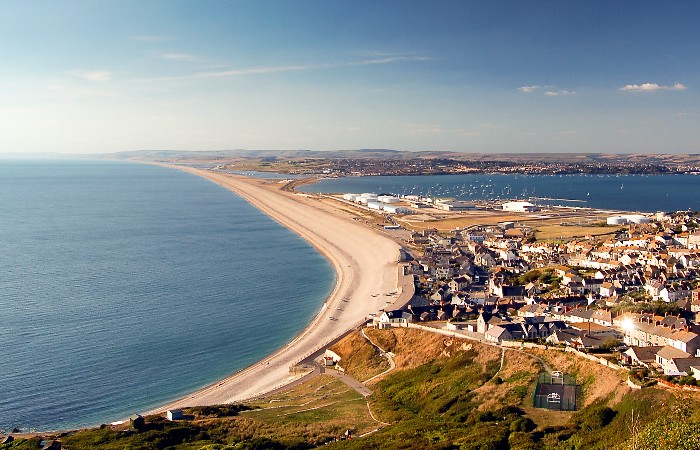 Pictured: Chesil Beach along Lyme Bay as seen from the heights of the Isle of Portland.